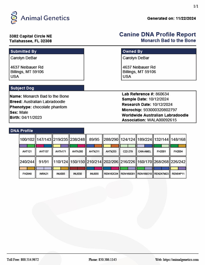 Full DNA test report, Embark 7/14/23, available on request.